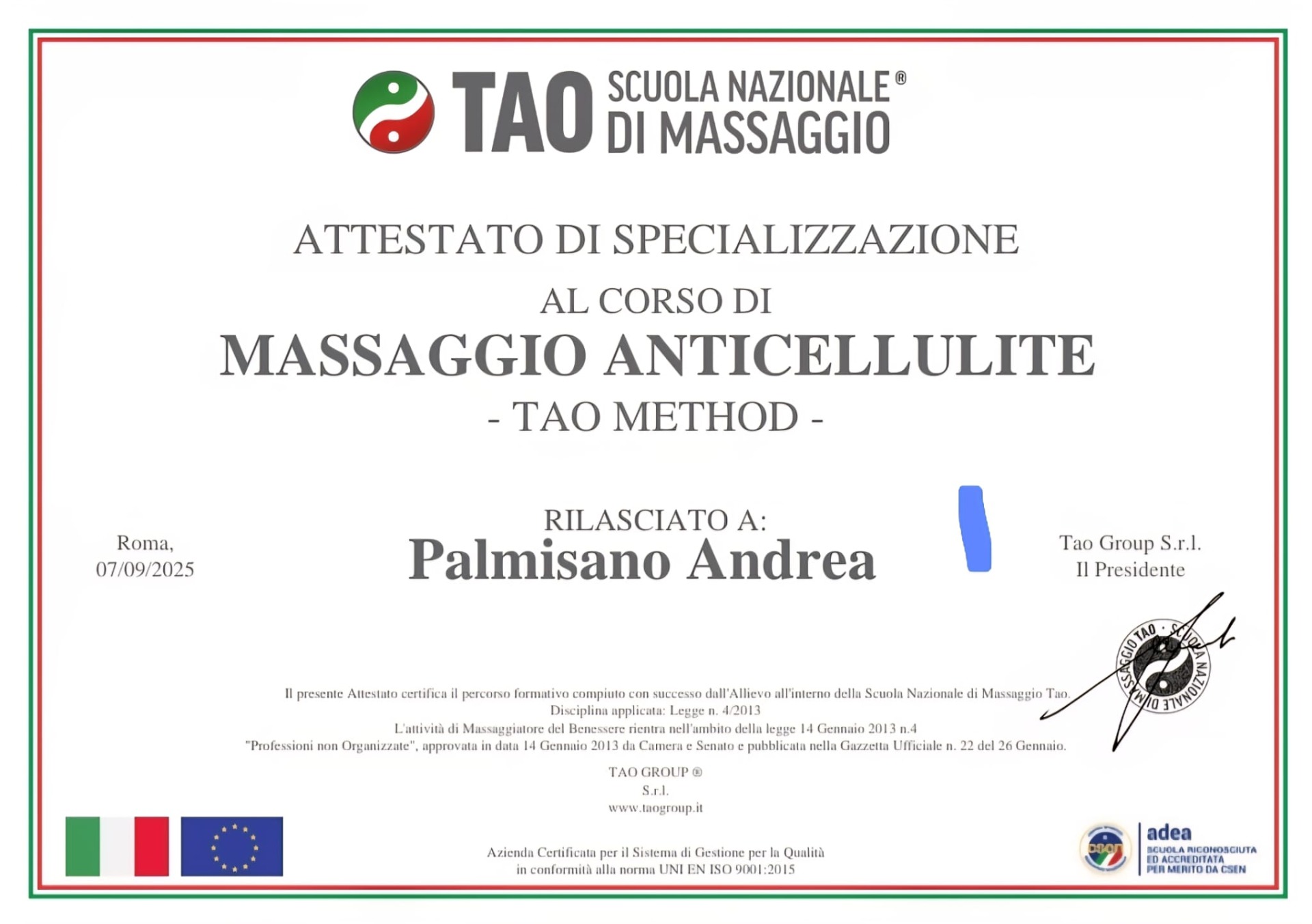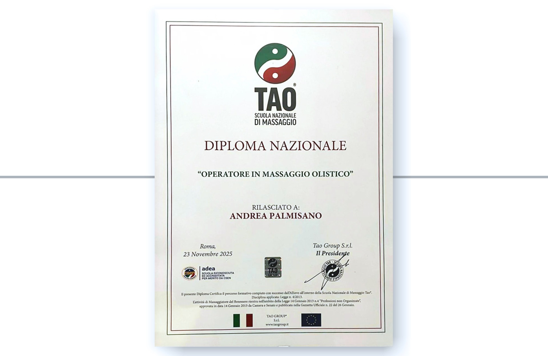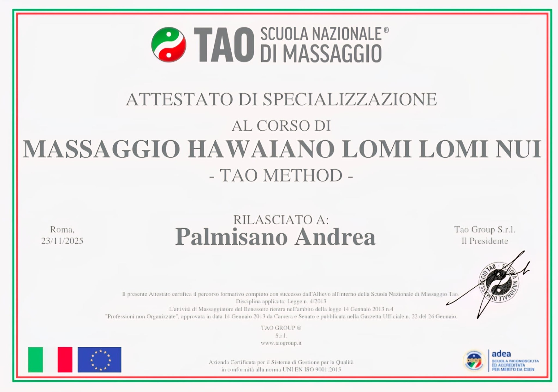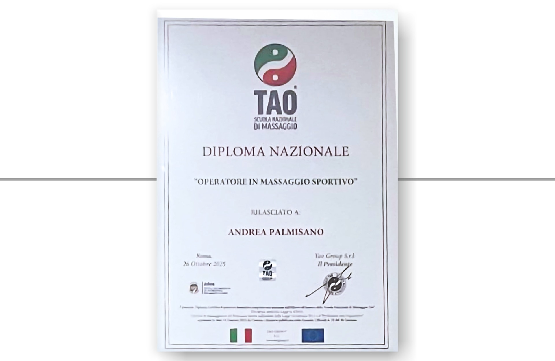 La mia formazione proviene dalla Scuola TAO Massaggi Nazionali