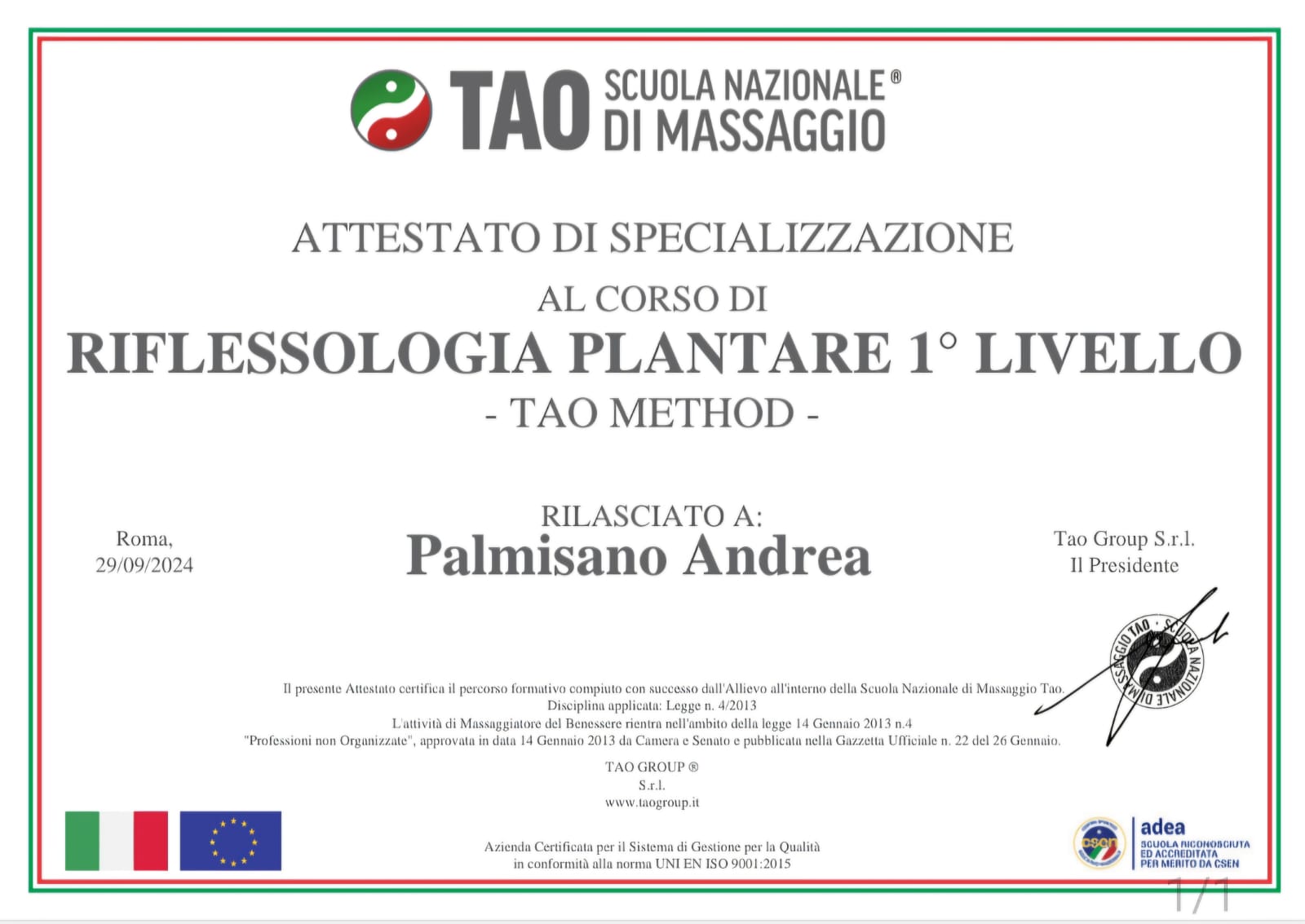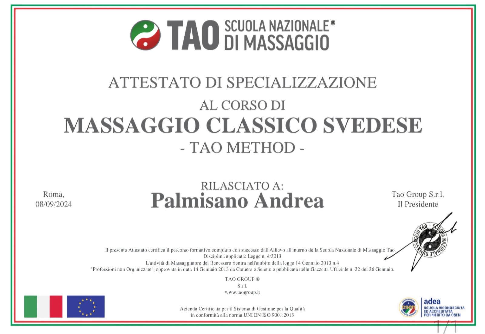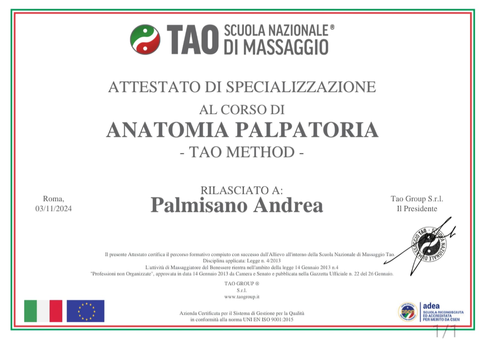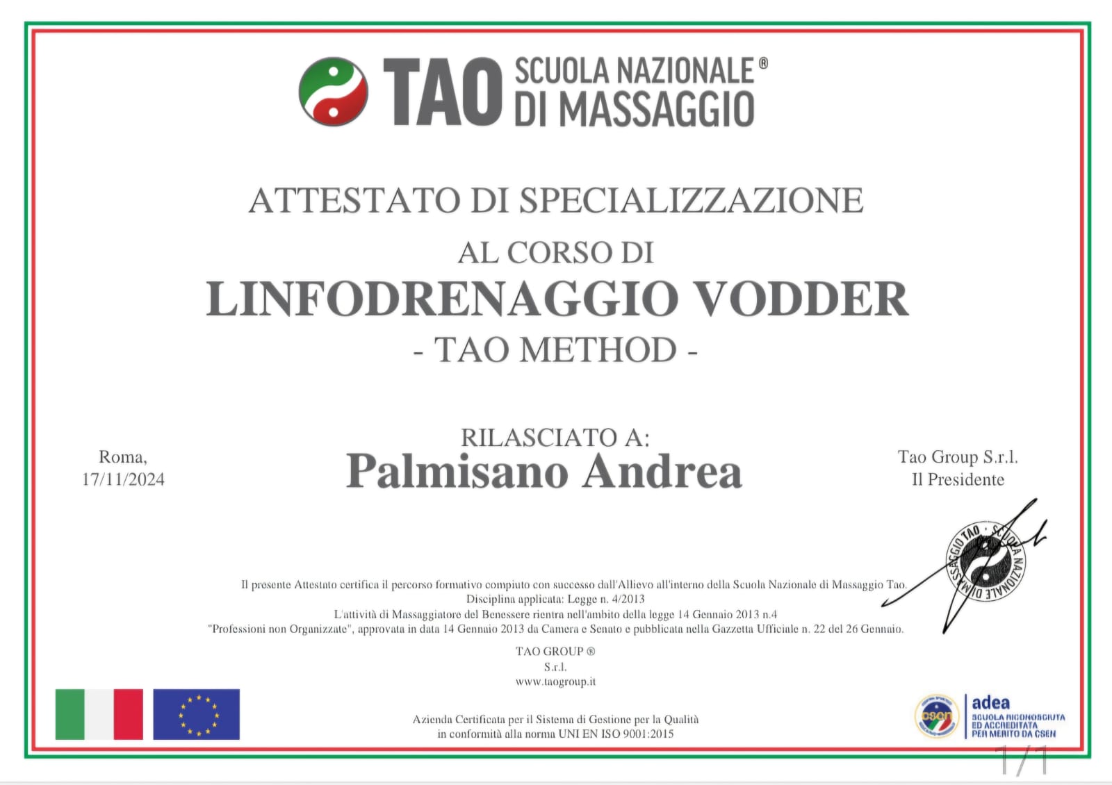 La mia formazione proviene dalla Scuola TAO Massaggi Nazionali