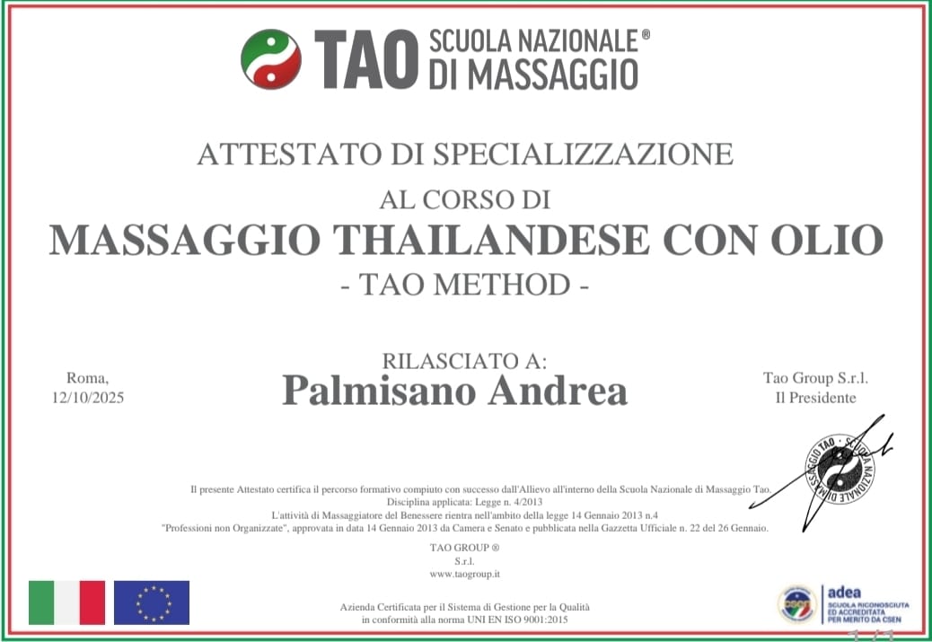 Mi sono qualificato presso la scuola Tao Massaggi come massaggiatore olisitco certificato attraverso diplomi e attesti di perfezionamento. Eseguo massaggi olistici personalizzati, concepiti per sciogliere tensioni e ristabilire un naturale stato di serenità. Attraverso tecniche come il massaggio svedese, la riflessologia plantare thailandese, il massaggio hawaiano lomi lomi nui, il massaggio bio-decontratturante, il massaggio kobido per il lifting naturale al viso, il massaggio californiano, il massaggio bio-drenante e il massaggio thai oil, accompagno ogni persona in un momento di autentico benessere.
